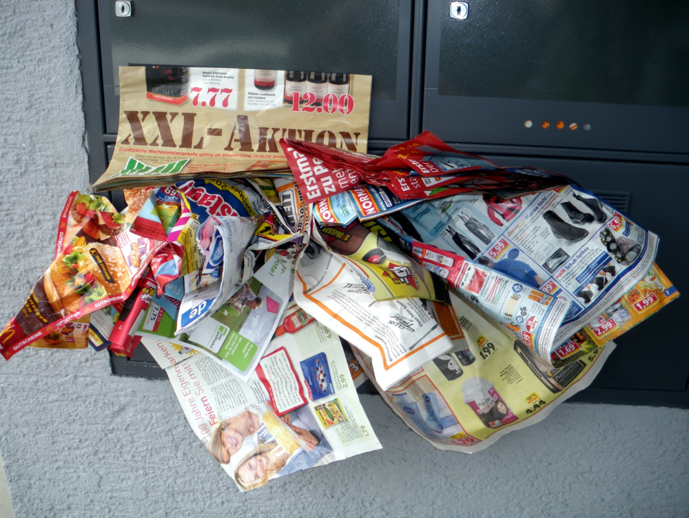 Tone de materiale publicitare tipărite sunt aruncate aproape imediat după folosire. Potrivit studiului Zero Waste France association, doar în Franța, o singură familie primește anual în cutia poștală, peste 30 de kilograme de materiale tipărite nedorite. Chiar dacă sunt tipărite pe din hârtie reciclată, ele folosesc în continuare o resursă valoroasă, dificil de reînnoit – mii de copaci. Pentru a obține o tonă de hârtie sunt tăiați peste 20 de copaci.