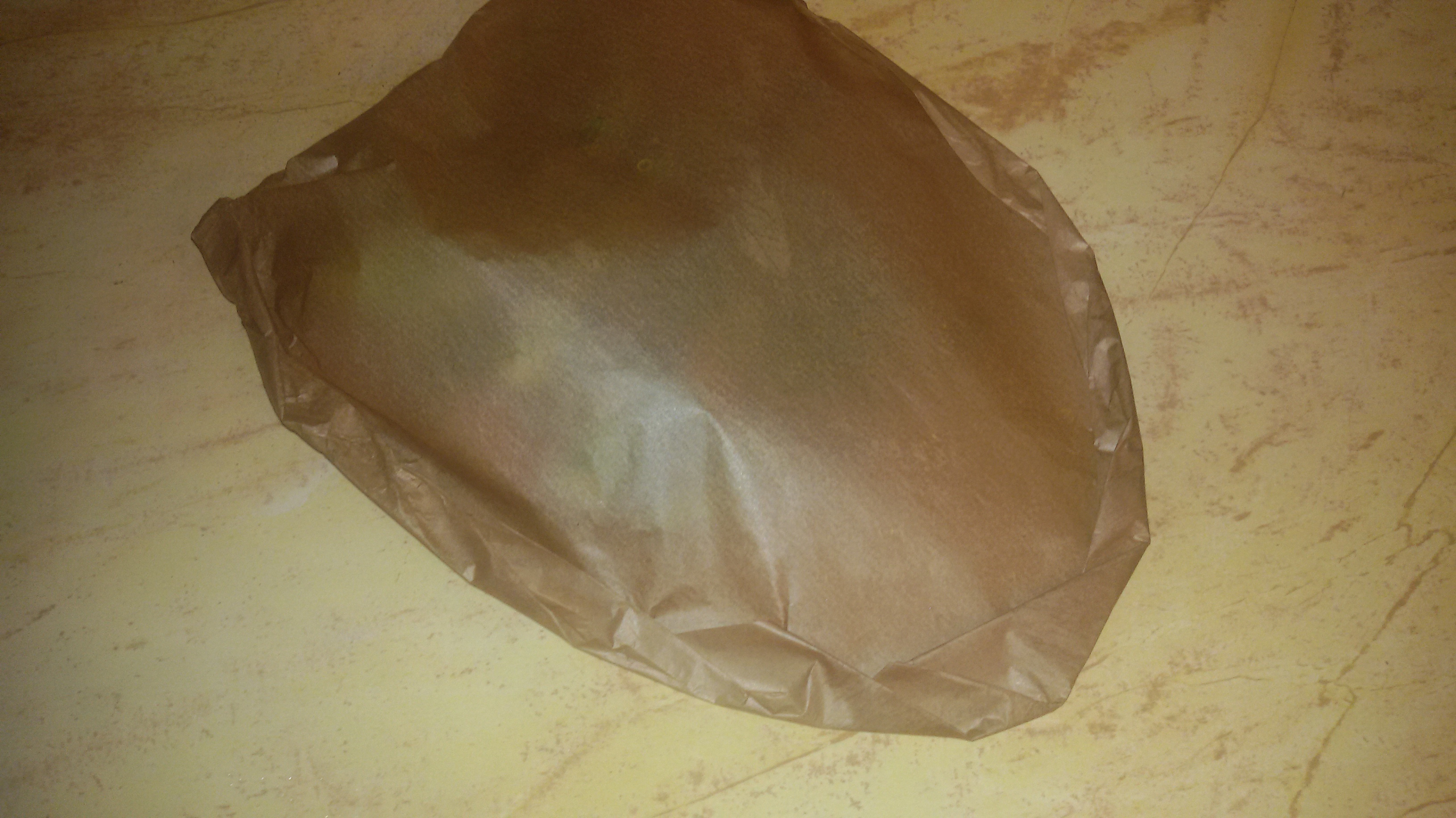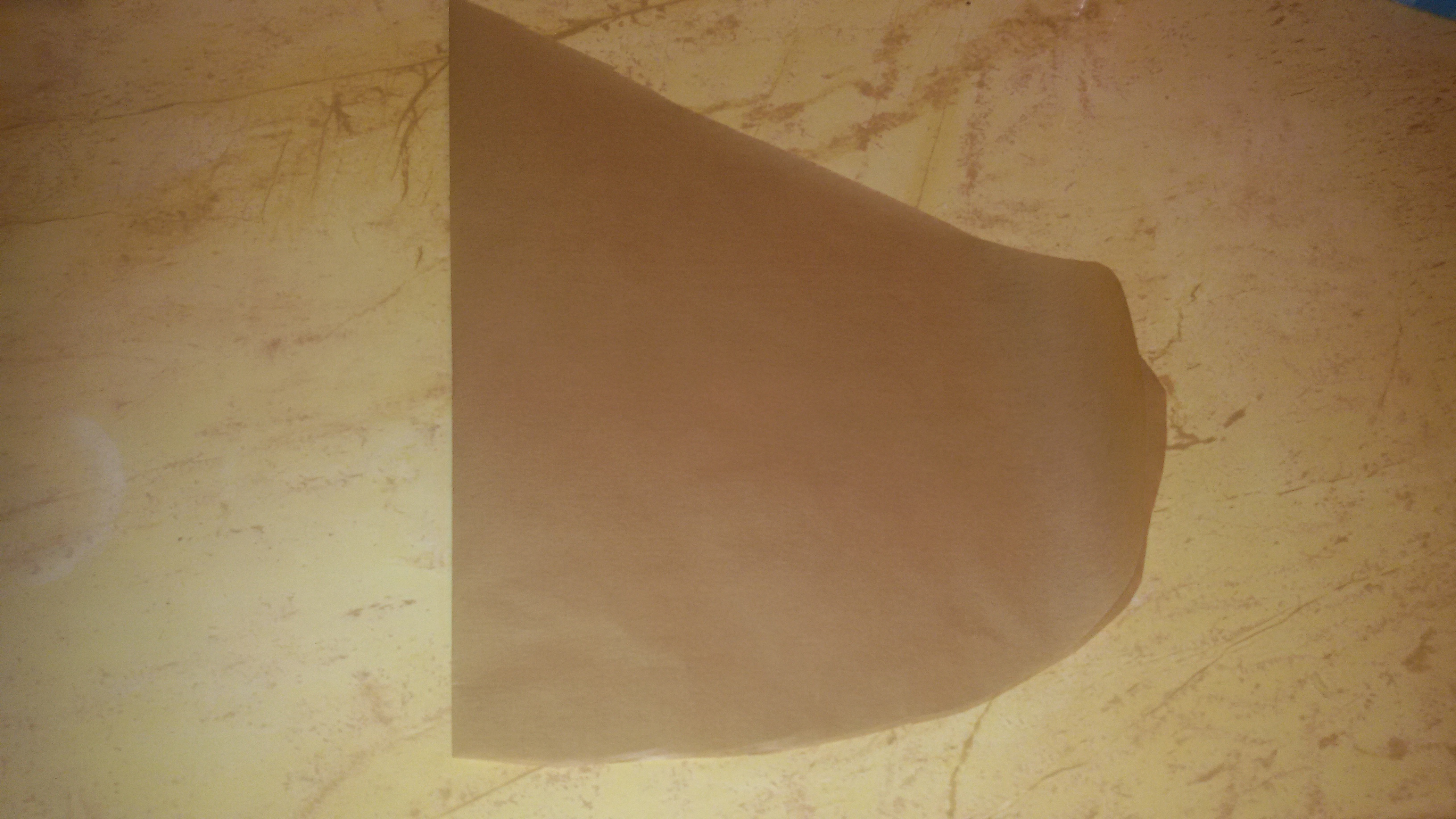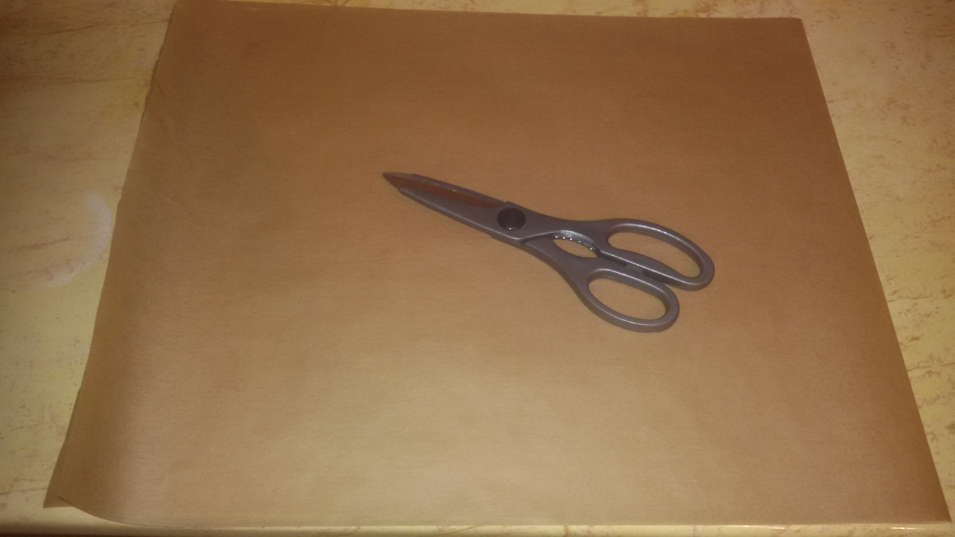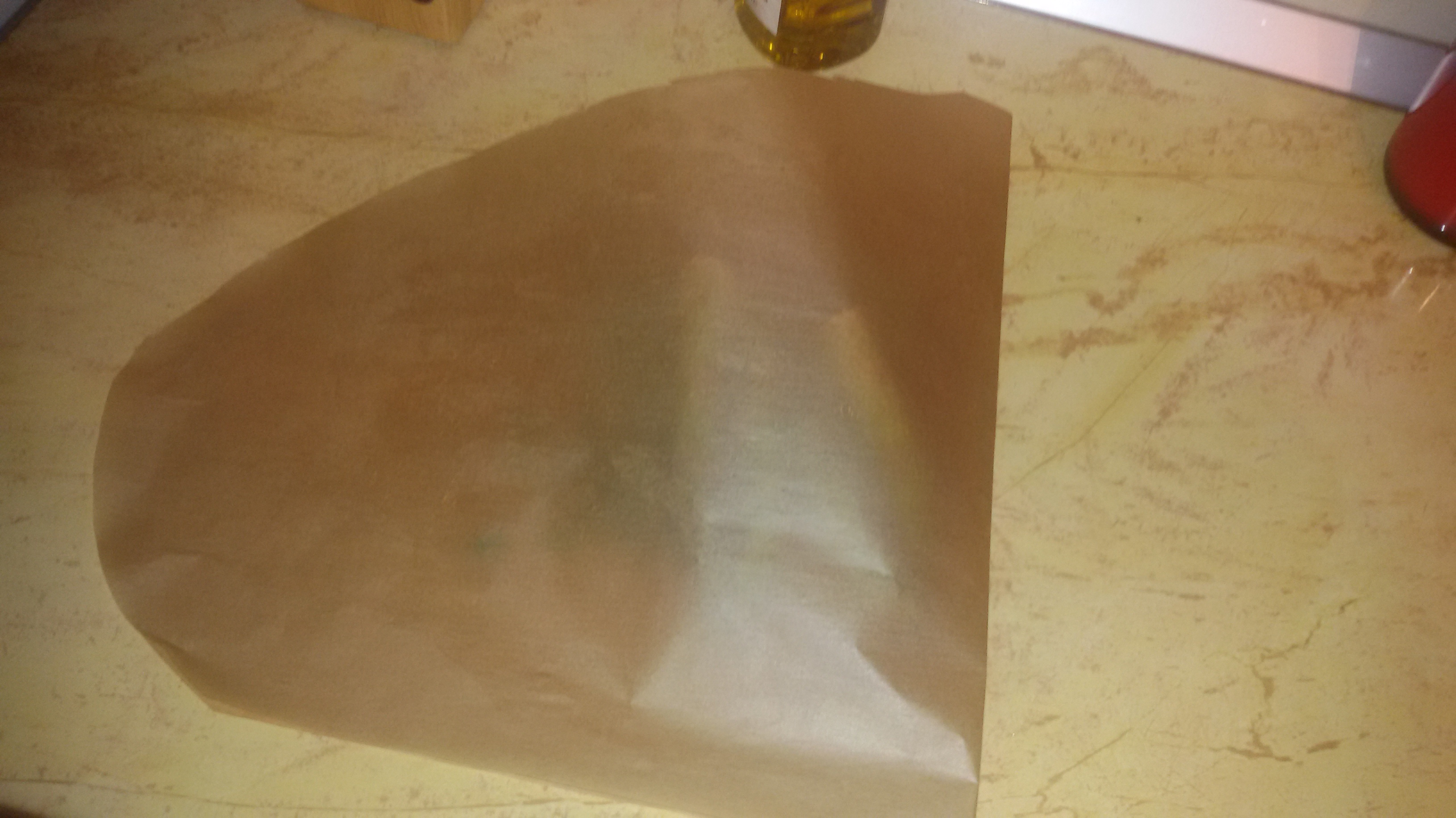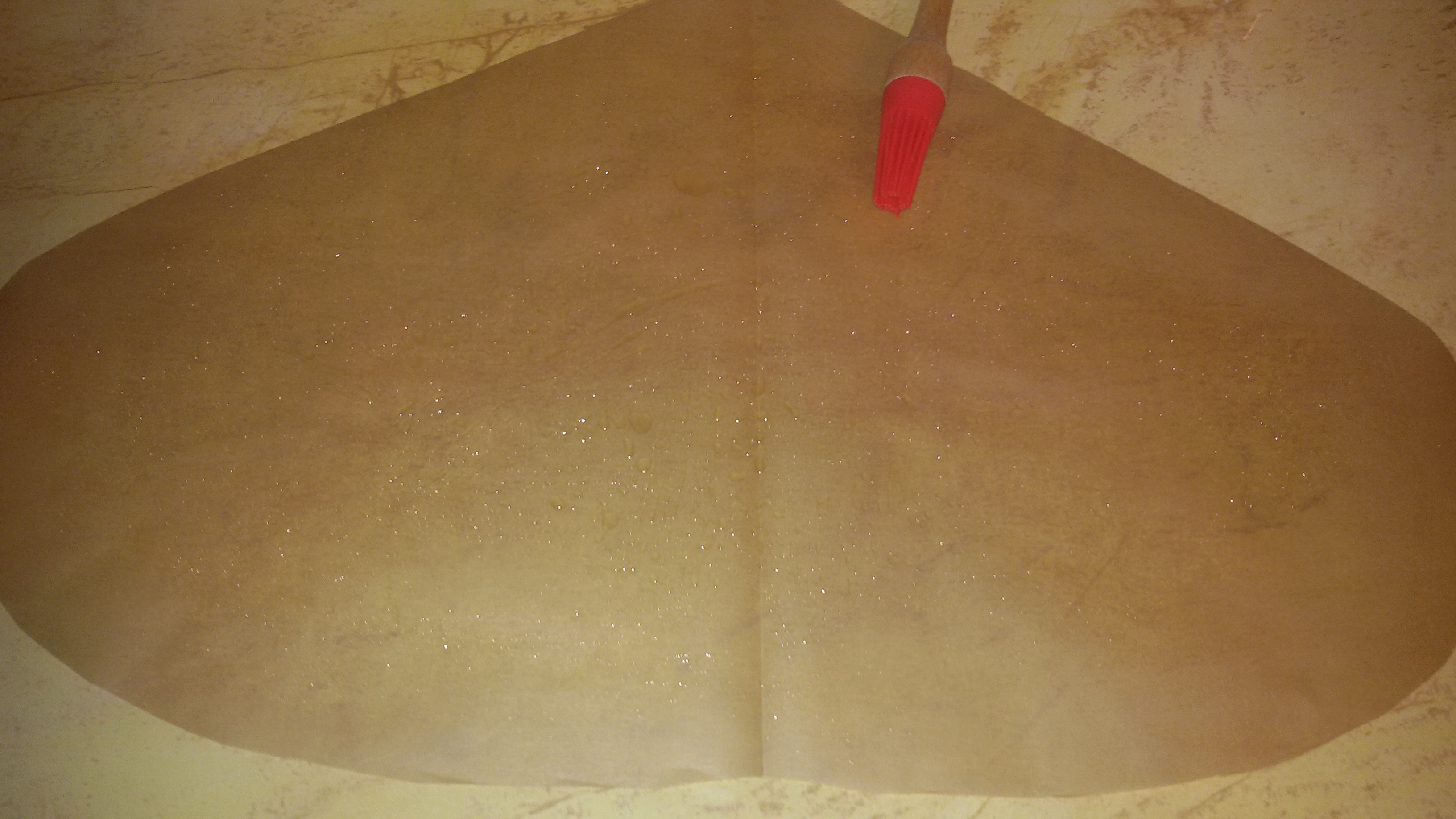 1. Deruleaza o lungime considerabila de hartie de copt, aproximativ 1.5-2 m pe lungime. Impatureste-o o data si, pornind din partea opusa indoiturii, dintr-unul din colturi, rotunjeste hartia folosind foarfeca, dandu-i forma unei jumatati de inima. Deschide hartia si unge-o pe ambele parti cu ulei.
