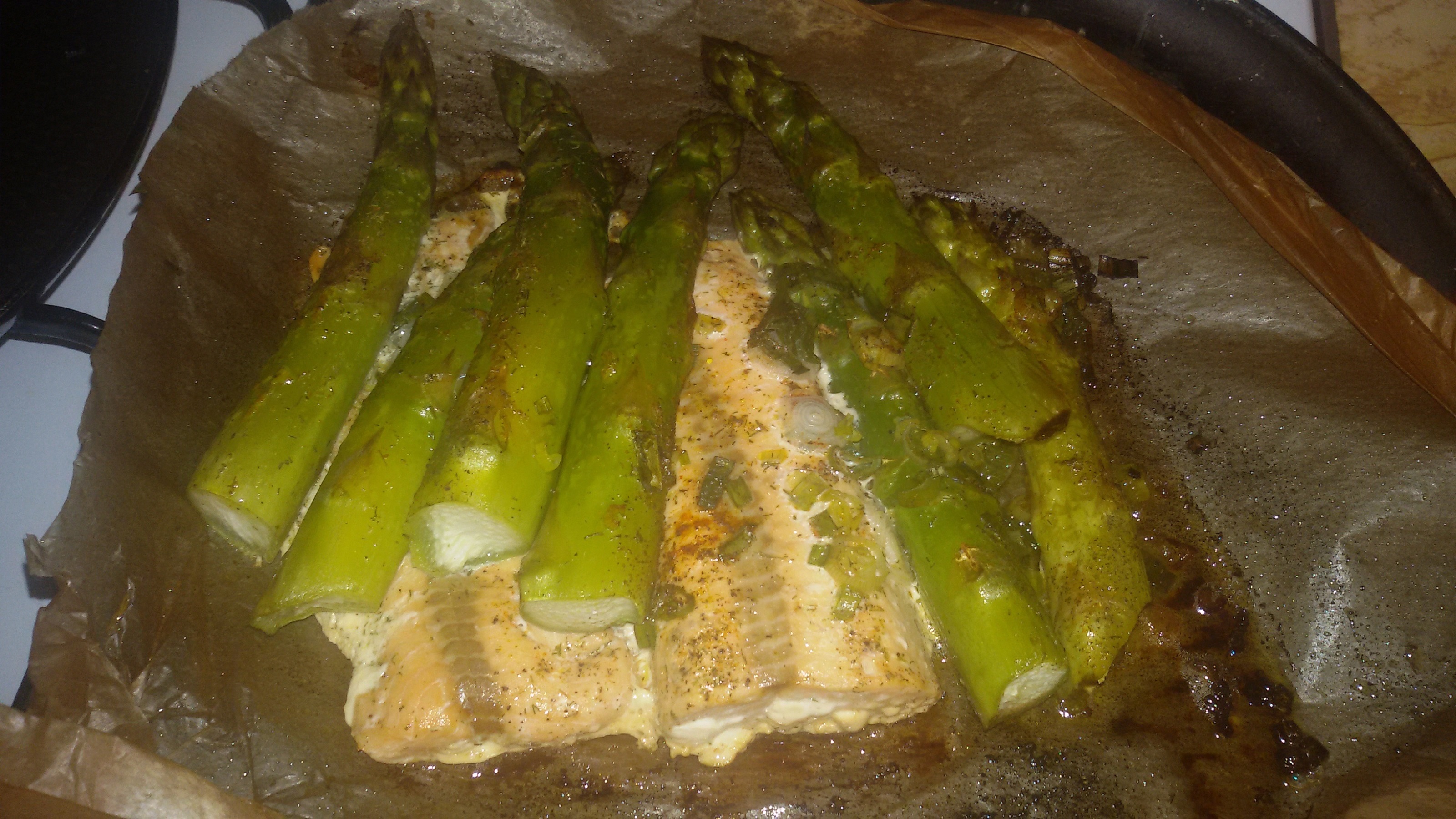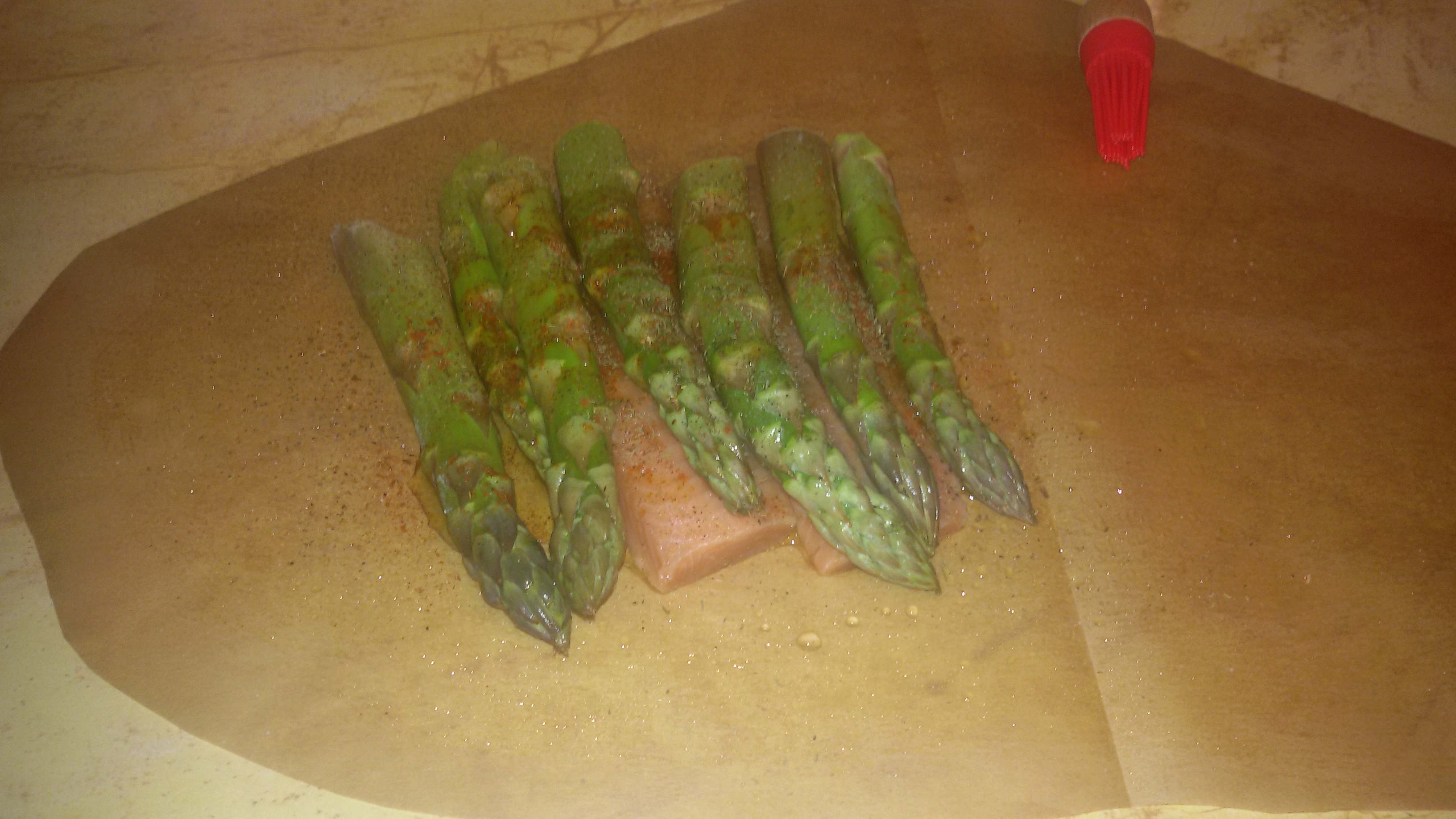 2. Asaza in mijlocul „inimii” fileul de somon sau orice alta carne la alegere, alaturi de legumele preferate (broccoli, sparanghel, cartofi, eventual prefierte pentru 2-3 minute) si potriveste de sare, piper, condimente si verdeturi. Stropeste ingredientele cu putin ulei de masline si impatureste hartia la loc, asa cum era cand ai taiat-o.