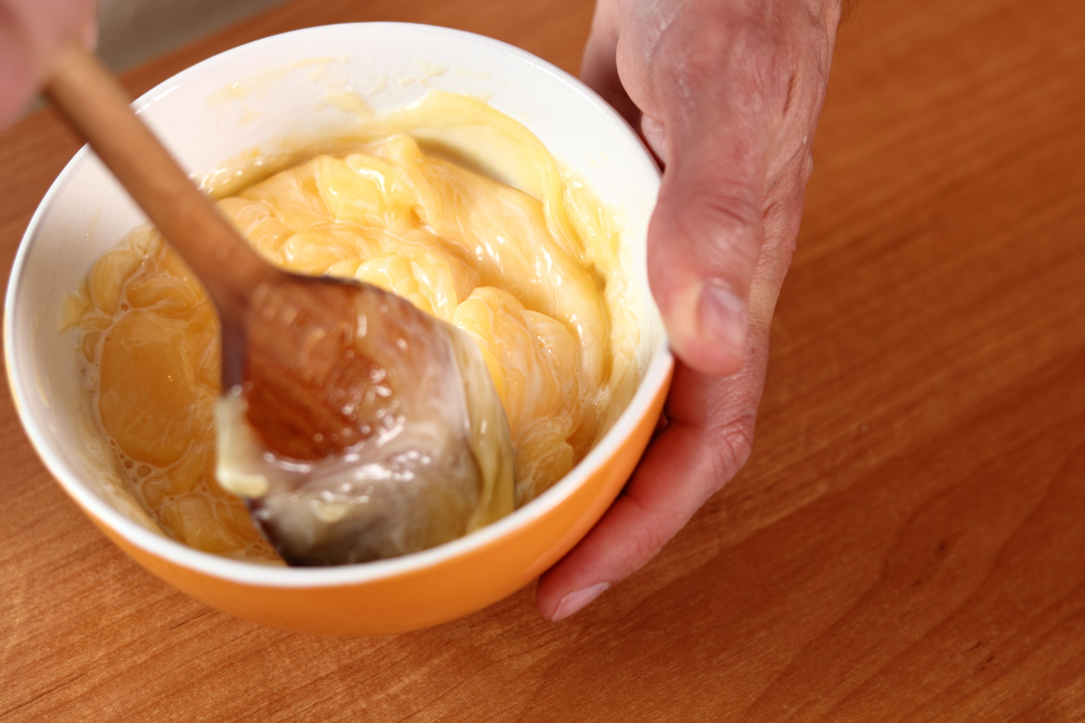 2. Amesteca incet, folosind o lingura de lemn, pana ce maioneza din castron isi recapata forma cremoasa. Adauga pentru inceput o lingurita de maioneza taiata peste cea reparata si amesteca usor.