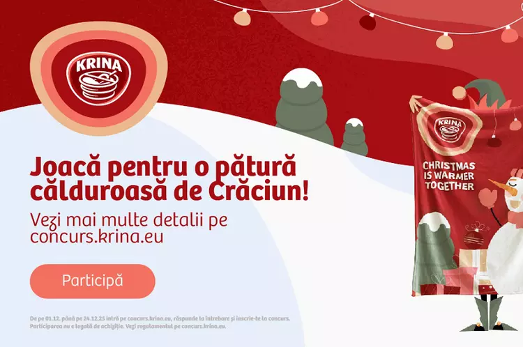 Și pentru că fiecare masă împreună trebuie răsplătită, Krina te invită să participi la un concurs unde poți câștiga una dintre cele 24 de pături călduroase de Crăciun. Vezi concursul pe concurs.krina.eu.