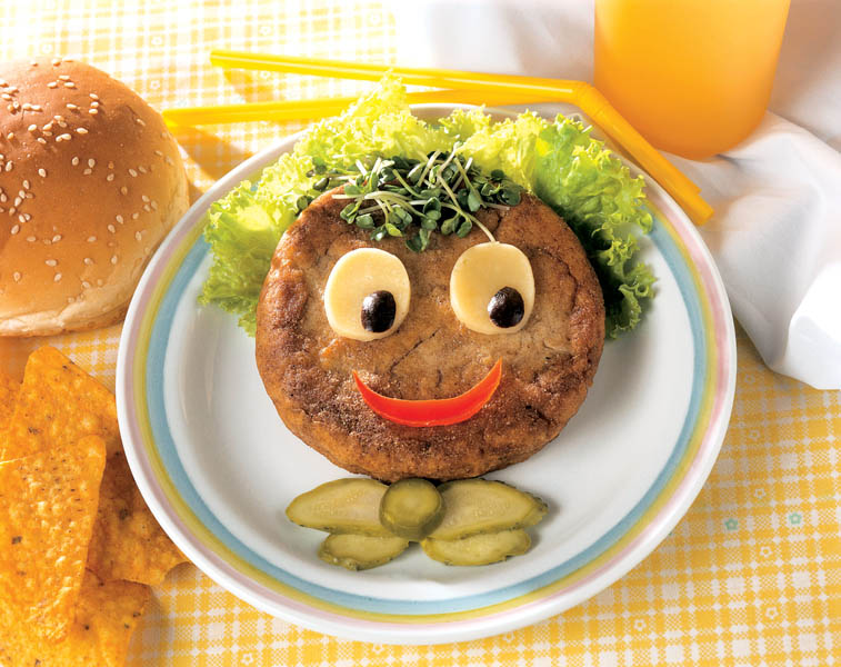 2. Verdeaţa se spală şi se toacă mărunt. Se pune sarea, oul, piperul şi usturoiul şi se amestecă bine până se omogenizează. După ce s-a pregătit pasta de carne se formează hamburgerii şi se pun la prăjit în uleiul încins. Se prăjesc 5 minute pe o parte şi 5 pe cealaltă şi se lasă să se scurgă de ulei pe un prosop absorbant de bucătărie. Se ornează cu legume pentru a semăna cu o feţişoară fericită ca cea din imagine sau alte mutriţe haioase.