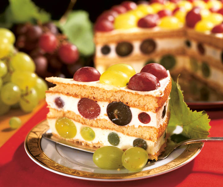 4. Între timp, se spală boabele de struguri şi se lasă să se scurgă. După ce s-a răcit blatul, se împarte în trei foi. Prima foaie se aşază pe un platou, se întinde primul strat de cremă, se presară boabele de struguri pe toată suprafaţa, se pune a doua foaie, şi tot aşa. Se ornează cu cremă şi boabe de struguri. Se serveşte după ce a fost lăsat 2-3 ore la rece.