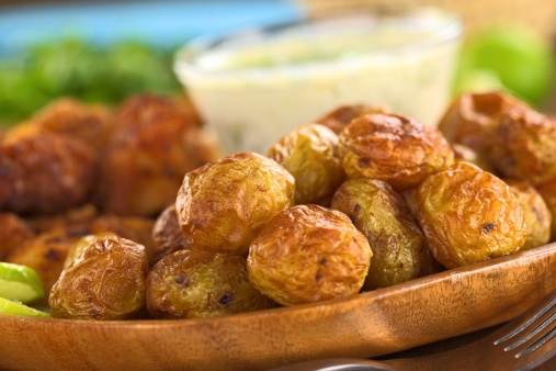 4. Într-un bol, se amestecă iaurtul cu 2 linguri de ulei de măsline, sare și mărar. Se adaugă și castraveții și se lasă la rece. Se scot cartofii și se servesc cu sosul tzatziki.