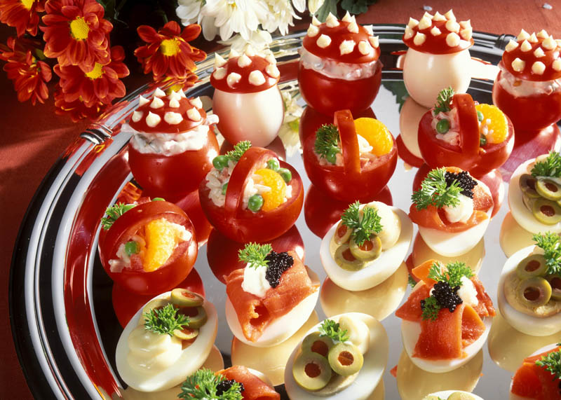3. Şase ouă se taie în jumătăţi şi se umplu cu maioneză şi măsline tăiate felii sau cu maioneză şi felii de peşte afumat.