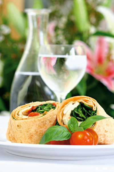 3. Pe bucăţile de tortilla se presară şuncă, mozzarella, cimbru, busuioc, spanac şi rozmarin, apoi se rulează strâns şi se înfăşoară în folie de plastic.
