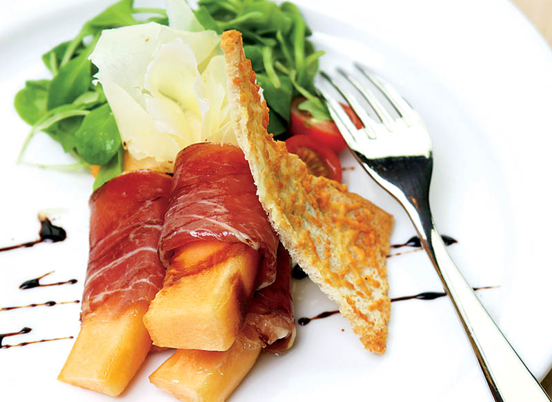 4. Se scot feliile de carne şi se înfăşoară bucăţile de pepene, se aşază pe un platou cu salata de pătrunjel, cu florile formate din gulie şi se servesc cu felii de lipii cu brânză, la aperitiv.