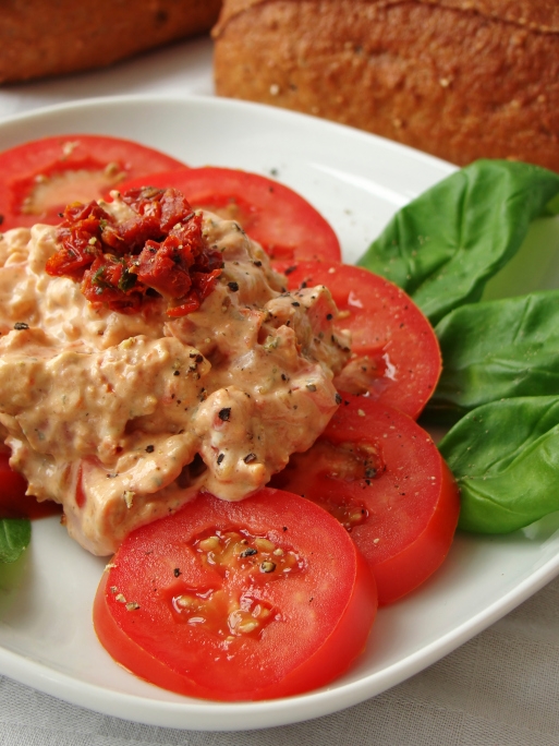 ► Se mai pun pe marginea farfuriei bucăţele de roşii uscate, se presară pătrunjel tocat şi se poate servi.