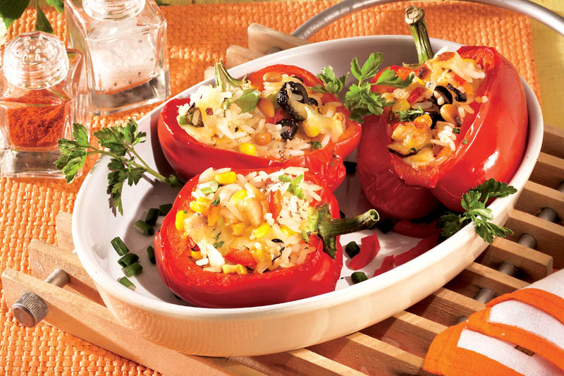 4. Se aşază ardeii umpluţi în tava unsă cu ulei, apoi se bagă în cuptor. Dacă este nevoie se mai stropesc din când în când cu apă şi după ce s-au rumenit puţin, se servesc calzi cu diferite salate.