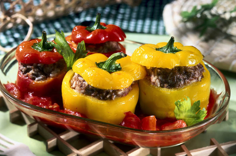2. Ardeii graşi se spală, se taie în dreptul codiţei şi se curăţă de seminţe. Se umplu cu compoziţia de carne tocată şi se aşază într-o cratiţă cu puţin ulei. Se adaugă roşiile tăiate cubuleţe şi se completează cu apă, cât să acopere ardeii până la trei sferturi.