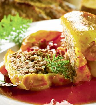 4. Între timp, se umplu ardeii, se toarnă sosul peste ei cât să-i acopere şi se pun să fiarbă, la foc potrivit. După ce au dat în câteva clocote, se scot şi se bagă în cuptor să se rumenească. Se servesc ornaţi cu mărar şi smântână.