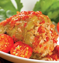 4. Se umplu ardeii cu orez, se acoperă cu sucul de roşii, cu felii de roşii, se presară cimbru uscat şi măcinat şi se bagă în cuptor. Se servesc ornaţi cu pătrunjel proaspăt.