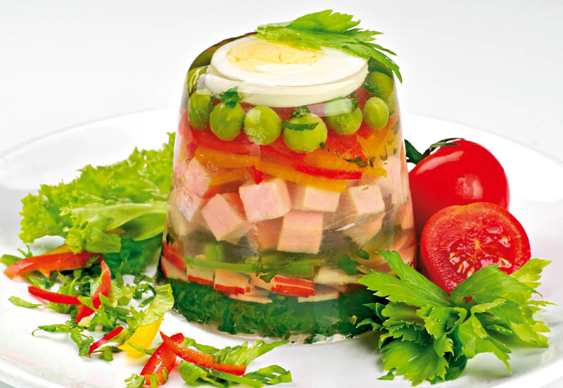 4. Gelatina se pune în zeama de carne, se amestecă bine, se pune şi usturoiul pisat şi se toarnă peste legumele din cupe. Se bagă la rece câteva ore şi se serveşte ca aperitiv.