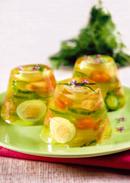 5. Gelatina înmuiată se dizolvă în restul de supă călduţă, deasupra unui vas cu apă caldă. Se potriveşte la gust cu sare şi zeamă de lămâie, se aromează cu verdeaţă şi se lasă să se răcească. Se toarnă în boluri şi se lasă la frigider minim 3 ore.