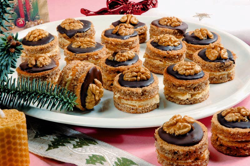 4. Se taie cu un pahar bănuţii din prăjitură. Se ornează cu câte o bulină din ciocolată menaj topită şi se lipeşte deasupra câte o jumătate de miez de nucă. Se poate tăia şi în alte forme sau, pur şi simplu, în pătrate.