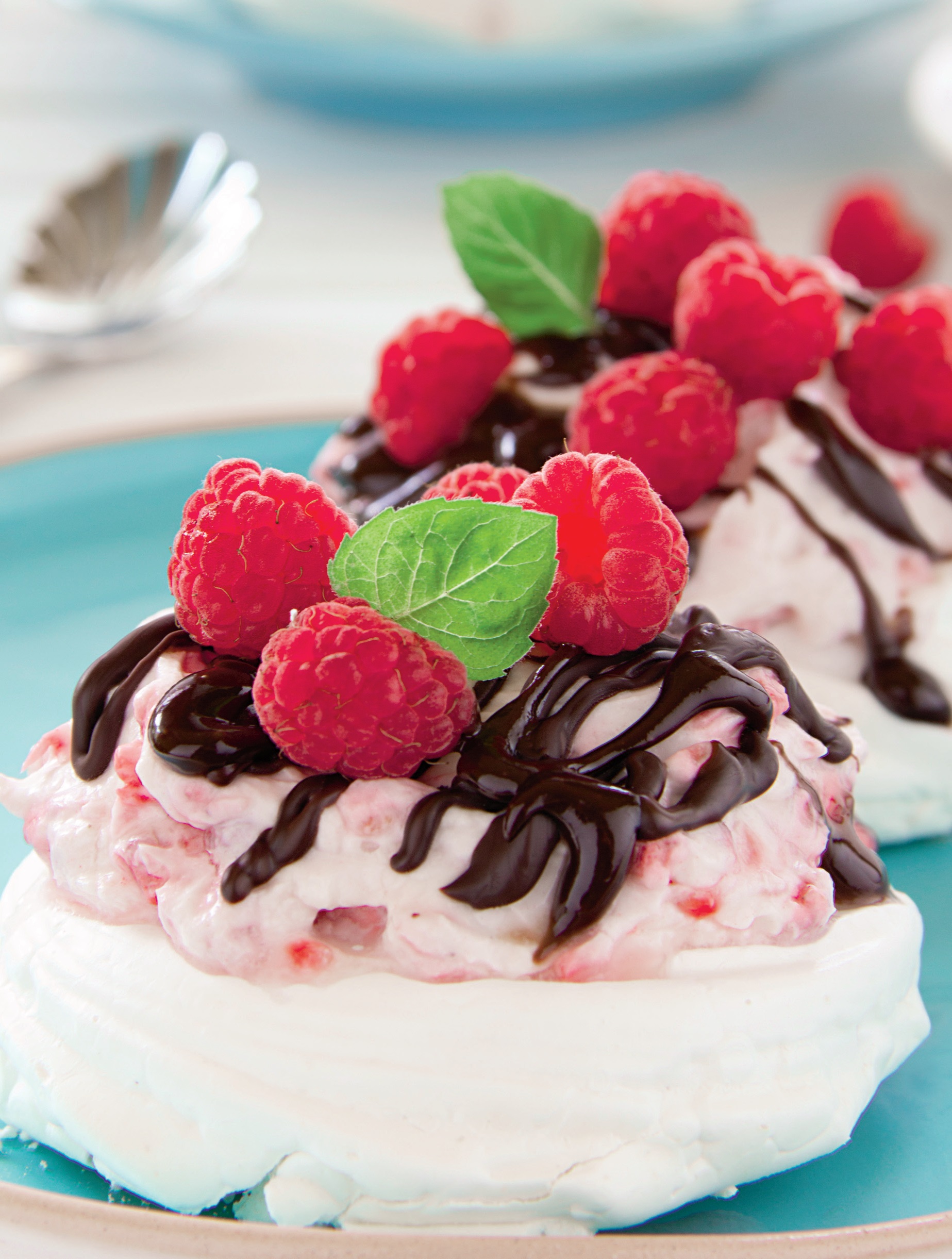4. Pentru servit, frişca se bate si, când este spuma, se adauga fructele marunţite separat. Se pune frisca pe bezelele racite, se stropesc cu sos de ciocolata si se aduc la masa cu fructe.
