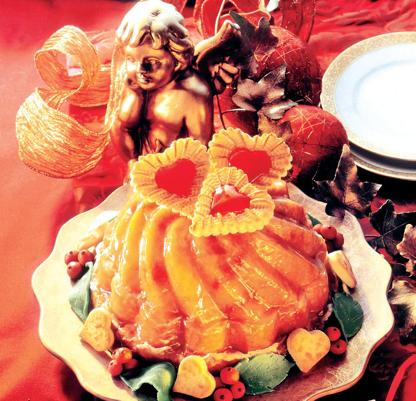 2. Caisele uscate se stropesc cu rom şi se lasă la scurs. Cireşele confiate se taie mărunt. Gelatina se înmoaie în 100 ml apă rece, timp de 10 minute. Peste fructele stoarse se toarnă 2 pahare de apă fierbinte, se pun la foc să dea un clocot şi se strecoară. În zeama obţinută se pun zahărul, gelatina dizolvată şi lămâia rasă. Siropul se ţine pe foc amestecând mereu, până începe să fiarbă. Când siropul s-a răcit, se adaugă fructele şi migdalele măcinate, apoi se bate cu telul până când compoziţia devine spumoasă. Imediat ce s-a îngroşat, se toarnă în forme şi se pune la rece.