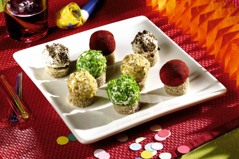 3. Cu mâinile umede, se formează biluţe din brânză. O parte se tăvălesc prin boia, altele prin nuci măcinate, altele prin pulbere de nucşoară, altele prin verdeaţă. Se aşază câte o biluţă pe o rondea de pâine şi se servesc.