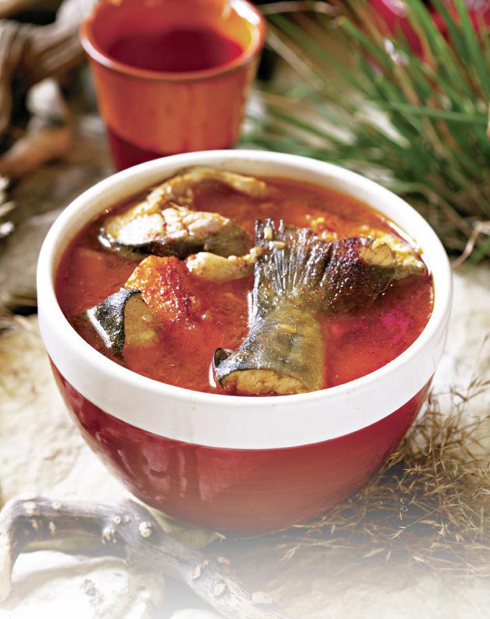 4. După ce au fiert peştele şi legumele, se adaugă borşul şi sucul de roşii şi se mai lasă să clocotească 5-6 minute. Se opreşte focul, se pregăteşte leuşteanul, se spală, se toacă şi se ornează bolurile cu borşul pescăresc, înainte de a se servi.