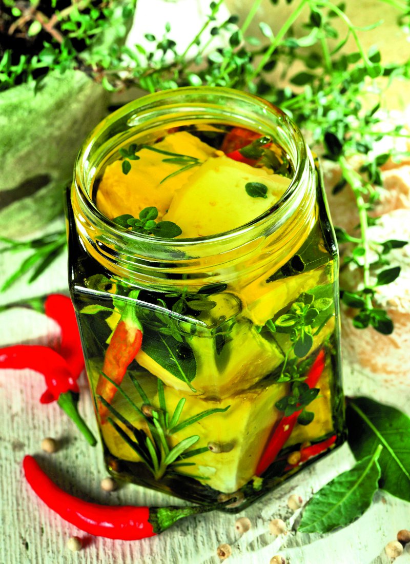 3. Se aşază într-un borcan brânza, rozmarinul, cimbrul, frunzele de dafin, ardeii iuţi şi boabele de piper şi se toarnă peste ele uleiul de măsline.