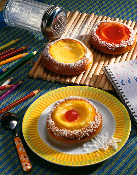 3. Se întinde aluatul într-o foaie groasă de aproximativ 1 cm. Se taie rondele de 6-7 cm şi se lasă din nou la crescut, 15-20 minute. Se presează apoi fiecare bucată de aluat şi se formează în mijloc o adâncitură, care se umple cu brânză dulce amestecată cu 1-2 linguri zahăr, zahăr vanilat şi 1-2 ouă.