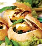Se taie chiflele, se scoate miezul, se stropesc cu unt topit în interior, se adaugă compoziţia de ciuperci şi spanacul şi se pun la cuptor să se rumenească.