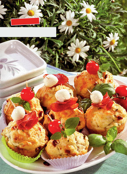 1. Formele pentru brioşe se ung cu unt, iar cuptorul se încinge. Făina cernută cu praful de copt se amestecă cu laptele, ouăle bătute cu sare şi puţin piper, untul frecat spumă, parmezanul, telemeaua rasă şi salamul tăiat cubuleţe.