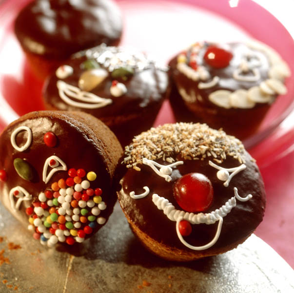 4. Pentru glazură, se topeşte ciocolata rasă în unt la cald, apoi se toarnă pe brioşe şi se ornează după preferinţe.