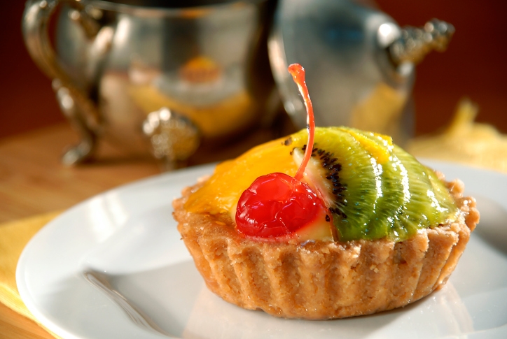 ► Se curăţă kiwi şi se taie bucăţi. Se spală cu atenţie zmeura şi se lasă să se scurgă. Se umple o treime din formă cu aluat, apoi se adaugă bucăţile de kiwi şi câte patru zmeure în fiecare formă. Apoi se umple restul de două treimi din formă cu aluat.