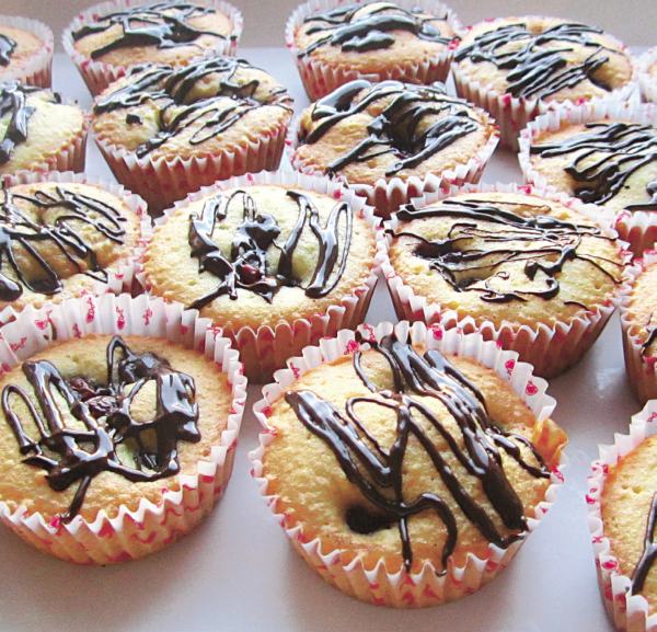 3. Pentru glazura, se topeste ciocolata pe baie de abur împreuna cu cele 2 linguri de ulei. Dupa ce s-au copt, se stropesc briosele cu sosul de ciocolata si apoi se lasa sa se raceasca.