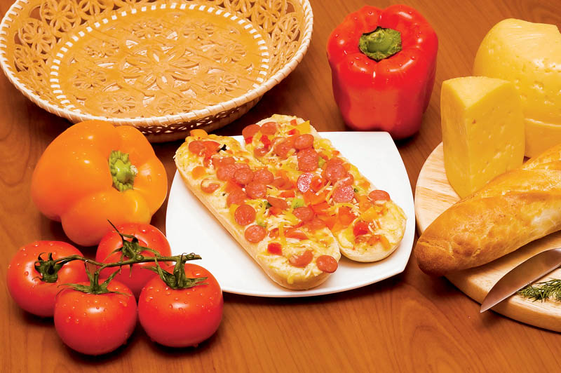 2. Se dă drumul la cuptor la o temperatură de 160 de grade şi se pregătesc ingredientele pentru umplutură. Se opăresc roşiile şi se taie cubuleţe sau se dau prin răzătoarea mică, acest aspect depinzând de cum le doriţi asezonate. Se taie cârnaţii rondele foarte subţiri, ardeii se taie şi ei felii foarte subţiri ca să se topească la cuptor şi se aşează pe minibaghete, aşa cum doriţi. Puteţi să le asortaţi în felul următor: 4 jumătăţi să le umpleţi cu roşii, măsline, ardei, mozzarella, cimbru şi busuioc, iar celelalte 4 să fie gratinate cu mai mulţi cârnăciori picanţi, bacon, ardei, mozzarella şi roşii.