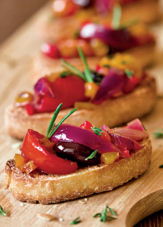 - După ce s-au rumenit feliuţele de baghetă, se garnisesc cu legumele coapte, se stropesc cu sosul din tavă şi se ornează cu rozmarin. Se servesc calde, împreună cu alte aperitive.