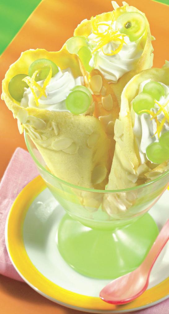 4. Se scoate aluatul, se mai frământă câteva minute şi apoi se întinde cu sucitorul, într-o foaie subţire. Foaia se împarte în 16 foi mai mici şi apoi fiecare foaie se rulează pe beţele pregătite în prealabil. Se aranjează în tavă la distanţe mici între ele şi se presară fulgi de migdale. Se bagă în cuptor şi se lasă 40 de minute la aceeaşi temperatură. După ce s-au copt, se scot cu grijă beţele iar tubuleţele se lasă să se răcească. Se umplu cu crema pregătită şi se ornează cu bobiţe de struguri şi coajă de lămâie sau de portocală.