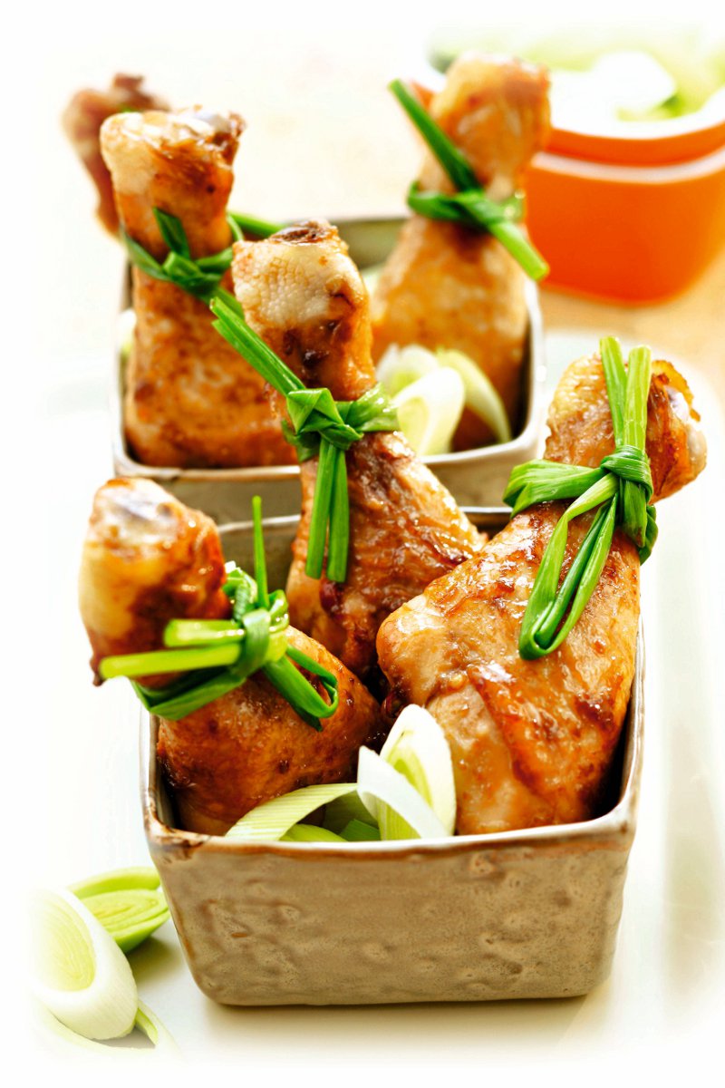 2. Se aşază ciocănelele în tava tapetată cu ulei şi pesmet. Se stropesc cu ulei de porumb şi se condimentează cu sare şi boia. Se bagă în cuptorul încins şi se lasă să se rumenească. Cu 5-6 minute înainte de a le scoate din cuptor, se stropesc cu miere.
