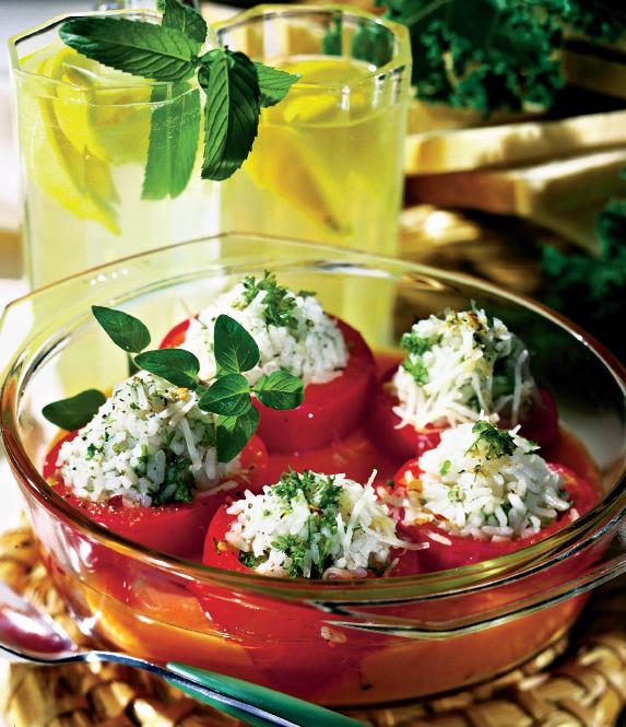 3. Se trece sosul printr-o strecurătoare. Se presează ca să se separe miezul roșiei de coajă. Se adaugă zahărul și sucul de lămâie. Se umplu coșuleţele de roșii cu orez. Se pun într-un vas termorezistent și se adaugă sosul. Se dau la cuptor circa