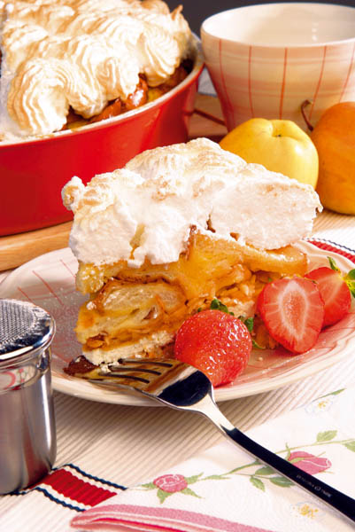 2. Se toarnă compoziţia într-un vas termorezistent uns cu unt şi tapetat cu pesmet, iar deasupra se pun albuşurile bătute spumă cu 3 linguri de zahăr şi zeama de lămâie. Se coace în cuptorul încins, la foc potrivit, 30-35 minute.