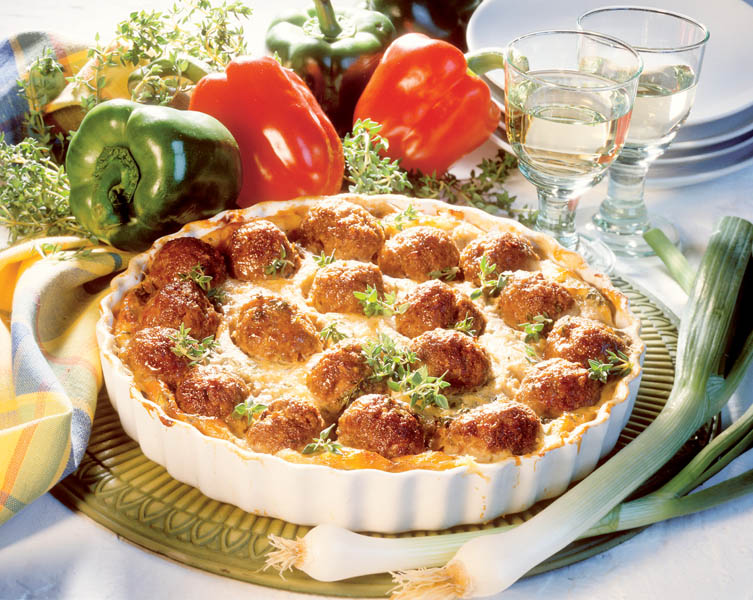 4. Se alege un vas potrivit pentru copt, se unge cu puţin ulei şi se tapetează cu pesmet. Se toarnă apoi piureul, se întinde într-un strat uniform şi se presară perişoarele. Deasupra se toarnă ouăle bătute cu 100 ml lapte, un praf de sare, puţin piper şi o lingură de pătrunjel verde fin tocat. Se coace în cuptorul încins, la foc tare, 45 de minute. În ultimele 15 minute focul se reduce la potrivit.