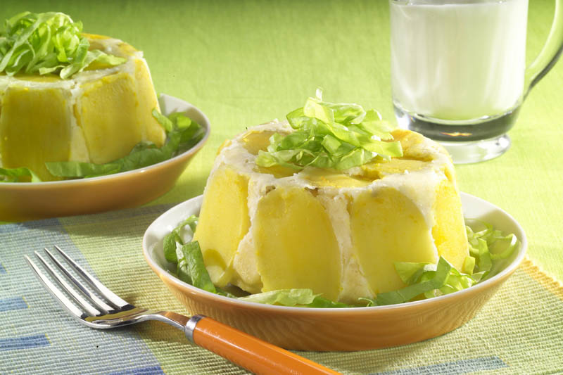3. După ce s-au fiert cartofii, se scot din apă şi se curăţă de coajă. Se taie rondele destul de groase pentru a nu se rupe atunci când se vor aşeza în tava de cuptor. Pentru a avea un aspect plăcut, se aşază în tavă în felul următor: se unge tava cu unt, se pune primul strat de cartofi, un strat de cremă, un strat de cartofi şi tot aşa până se umple tava. Se bagă în cuptorul bine încins 20 de minute. Apoi se lasă la rece. Budinca se răs-toarnă pe un platou şi se îmbracă cu restul de cremă de brânză, se ornează cu rondele de cartofi fierţi şi salată verde tăiată fâşii.