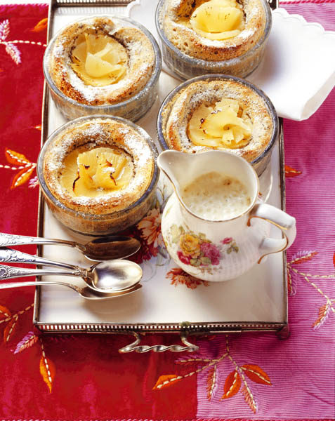2. Între timp, se bat gălbenuşurile cu zahărul şi untul înmuiat, iar albuşurile se bat spumă. Brânza proaspătă se pasează şi se amestecă cu orezul fiert, apoi se adaugă gălbenuşurile, jumătate din ananas şi albuşurile bătute spumă. Se toarnă în formele unse cu unt, se ornează cu restul de ananas şi se coace în cuptorul dinainte încins, la foc potrivit, 35-40 minute.