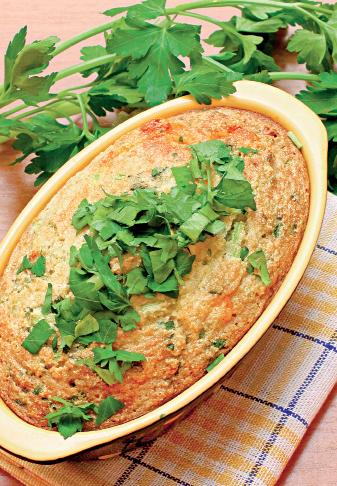 4. Se unge cu alt sfert din cantitatea de unt o formă termorezistentă. Se întinde în vas, în strat uniform, compoziţia preparată și se pune la fiert, pe baie de abur, pentru aproximativ 20 de minute. Se servește caldă, cu unt deasupra.