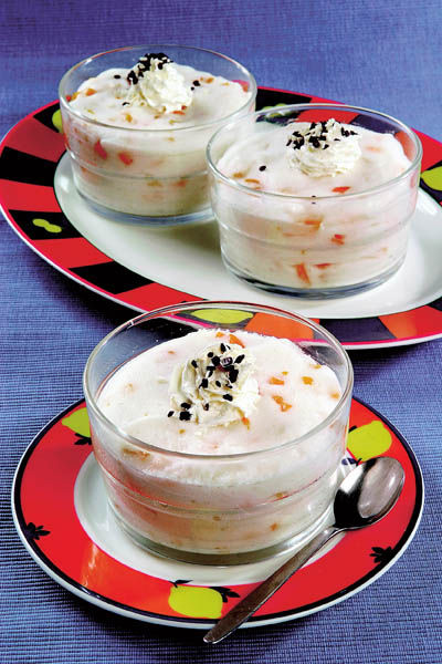 3. Se încorporează frişca, coaja de mandarină şi se toarnă compoziţia în forme care se udă în prealabil cu apă rece. Formele se bagă la rece şi, după câteva ore, budinca se servește ornată cu frişcă şi fulgi de ciocolată.