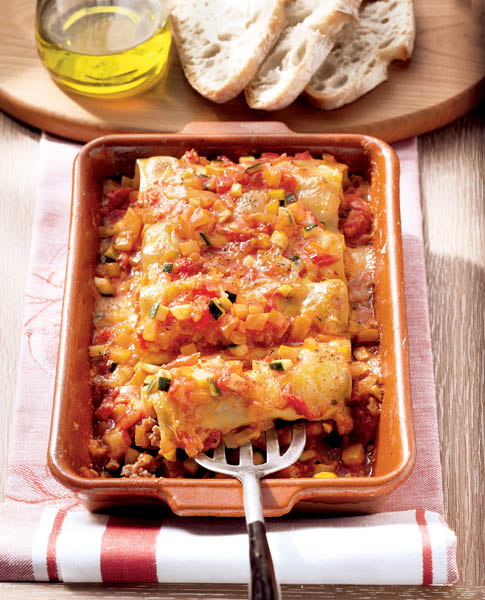 4. Se bagă la cuptor, acoperită cu un capac şi, spre sfârşit, se mai lasă 10 minute fără capac să se rumenească. Se servesc calde cu cascaval ras pe deasupra şi ornate cu busuioc.