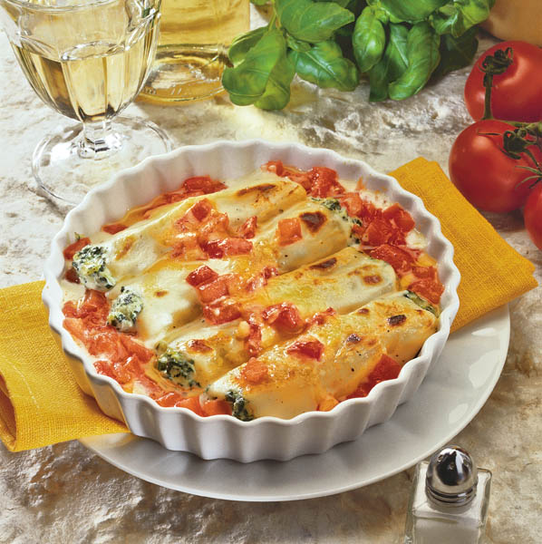 1. Într-un bol, se pun urda, ouăle, caşcavalul, mărarul tocat mărunt, brânza sărată şi spanacul. Se amestecă cu o lingură de lemn şi se umplu cannelloni. Se aranjează în tava de iena şi se bagă la cuptor.