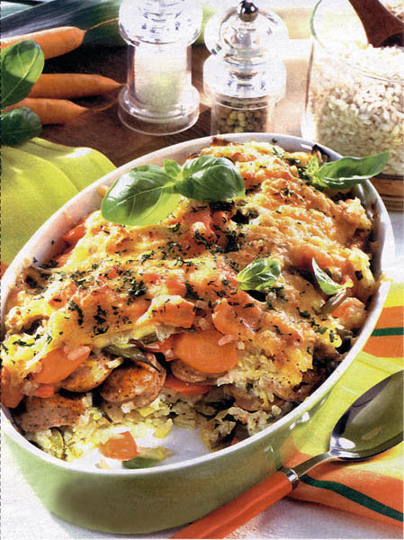 2. Cârnaţii se taie rondele şi se călesc într-o tigaie încinsă cu puţin ulei. Se adaugă la compoziţia de legume şi se condimentează dacă mai este cazul. Se pun în cuptorul încins şi se lasă 15 – 20 minute.