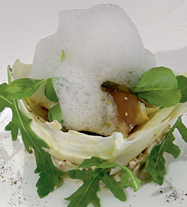 Mod de prezentare: Feliile de anghinare se lipesc între ele cu mousse-ul de brânză şi se reconstruieşte o anghinare. În mijloc se pun restul de brânză, feliile de roşii şi spuma din oţet de fructe.