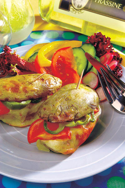 2. Fiecare jumătate de cartof se unge pe partea tăiată cu puţin unt, apoi se presară puţină sare şi câteva boabe de chimen. Între jumătăţile de cartof se pun roşiile tăiate felii, caşcavalul şi ardeiul gras tăiat rondele. Se prinde cu scobitori să nu se desfacă şi se aşază într-o tavă.