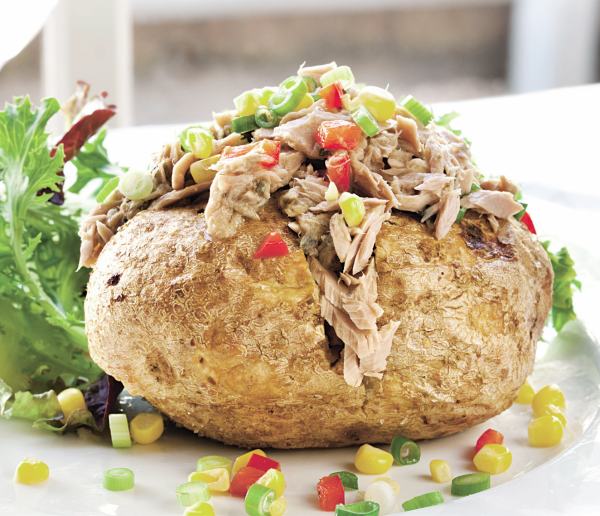 3. Cartofilor copţi li se face o taietura în patru si se umplu cu ton peste care se presara ardei, porumb si ceapa.