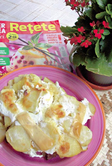 2. Se unge tava cu unt, se pune un rând de cartofi, un rând de ouă şi apoi mezelurile. Se condimentează după preferinţe, iar deasupra se pune ultimul rând, de cartofi.