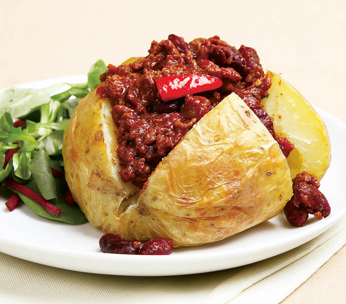 4. Între timp, se scot cartofii din apa în care au fiert şi se lasă să se răcească, apoi se crestează, se scoate puţin miez şi se adaugă umplutura picantă. Se bagă la cuptor să se rumenească şi se servesc cu diverse salate.