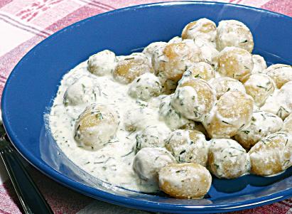- Cartofii noi, în coajă, trebuie spălați în 4-5 ape. Se pun apoi la fiert în supă de pui. Se adaugă de la bun început sarea, pentru că aşa cartofii vor rămâne întregi. Se lasă la fiert până sunt pe jumătate fierți și supa de pui scade destul de mult. Se ia de pe foc.